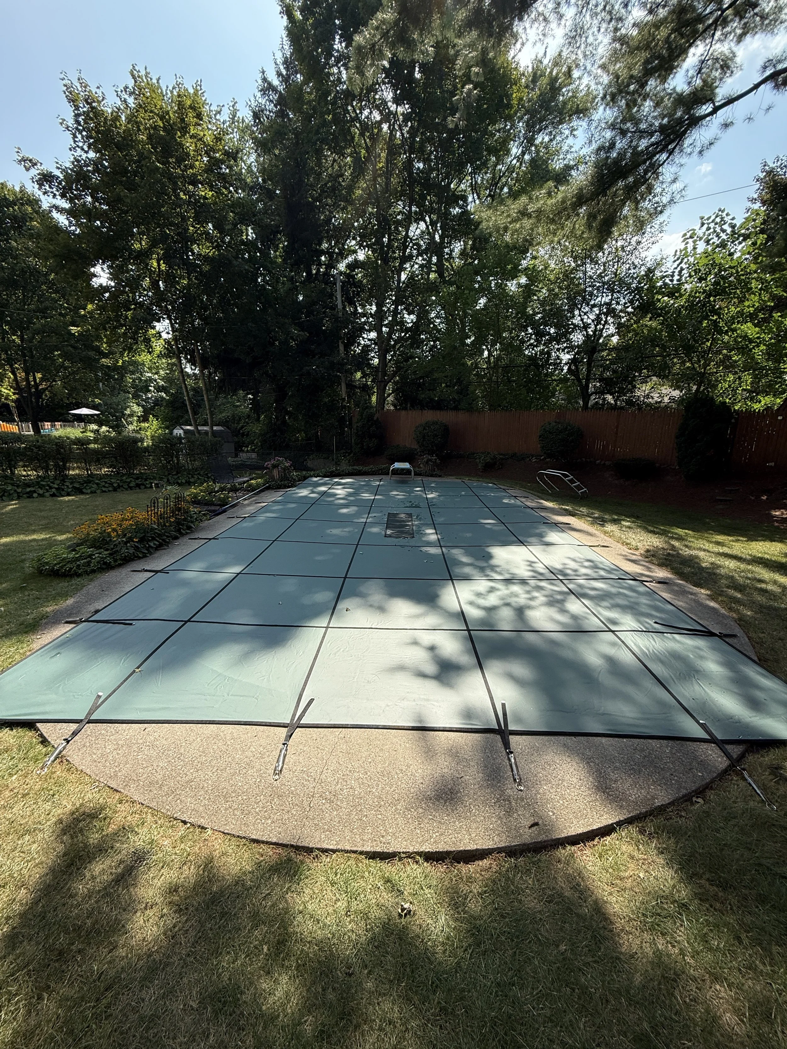 Cover carefully laid out across the pool — making sure there’s a perfect overlap all the way around! Every detail counts to ensure a snug, safe, and polished fit.